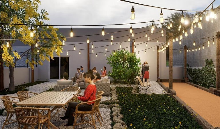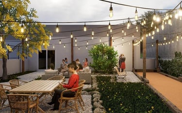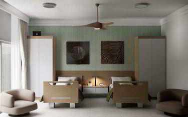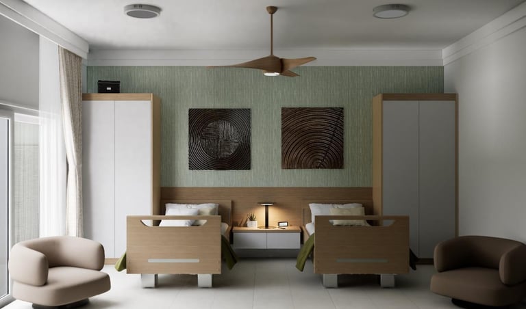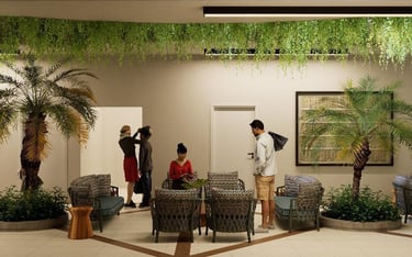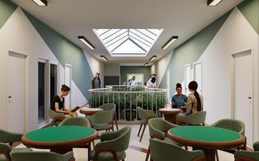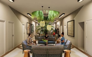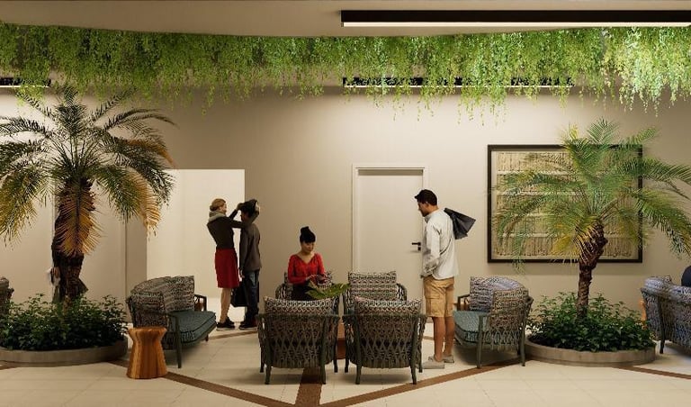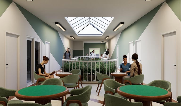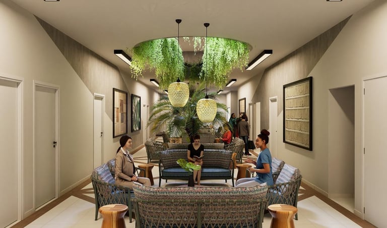 Ambientes planejados para conforto, interação e autonomia, com quartos, salas de convivência e áreas externas.